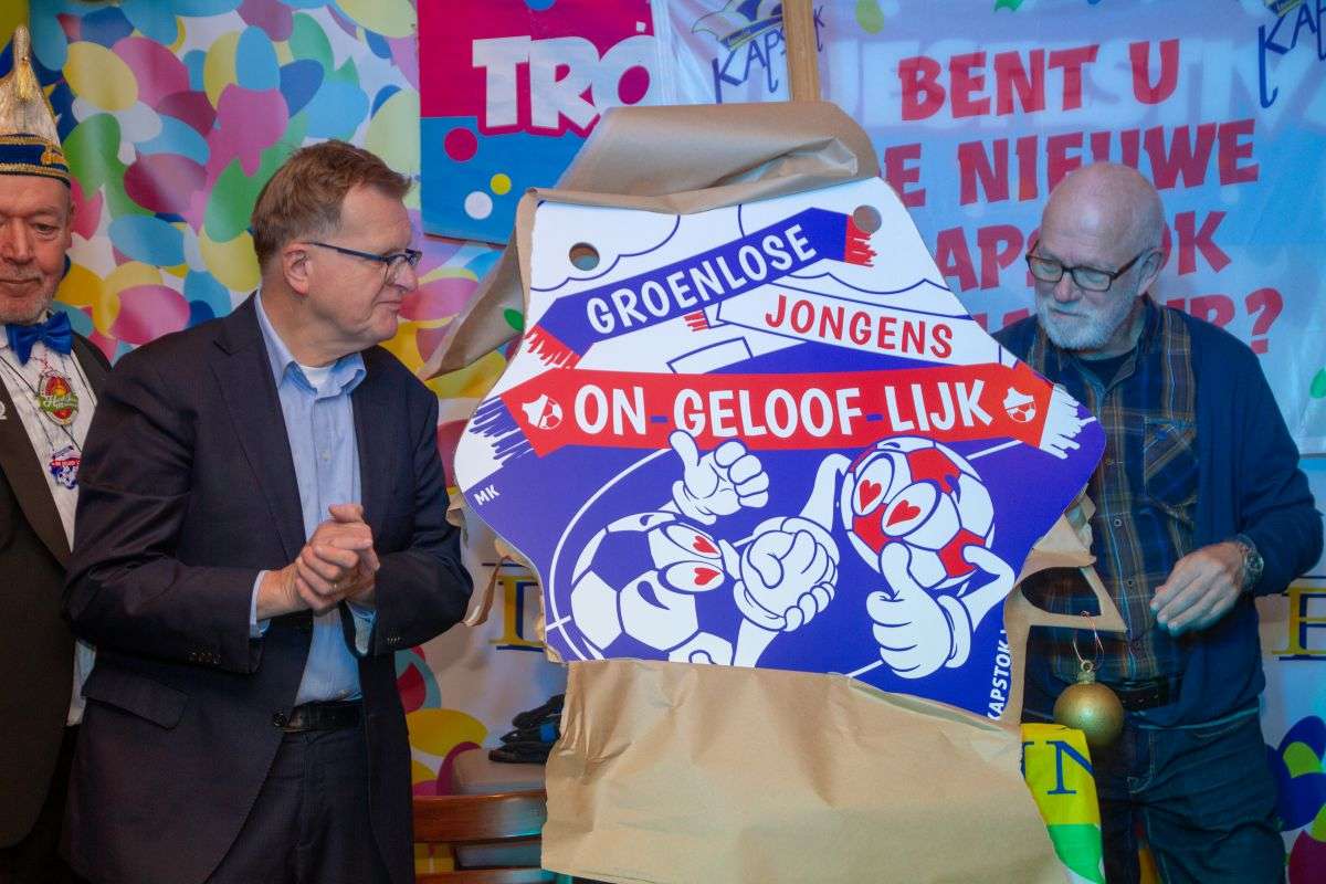 Als laatste werd het nieuwe ‘KAPSTOK’ logo onthuld door voorzitter Hans Scheinck van sv Grol en Harry Paf van Grolse Boys. Onder het toeziend oog van keeper bij de Grolse Boys en ‘raad van elf’ lid Barry Jansen onthulden beide heren het logo. Op het nieuwe kapstok logo staat de tekst: Groenlose Jongens on-geloof-lijk.
