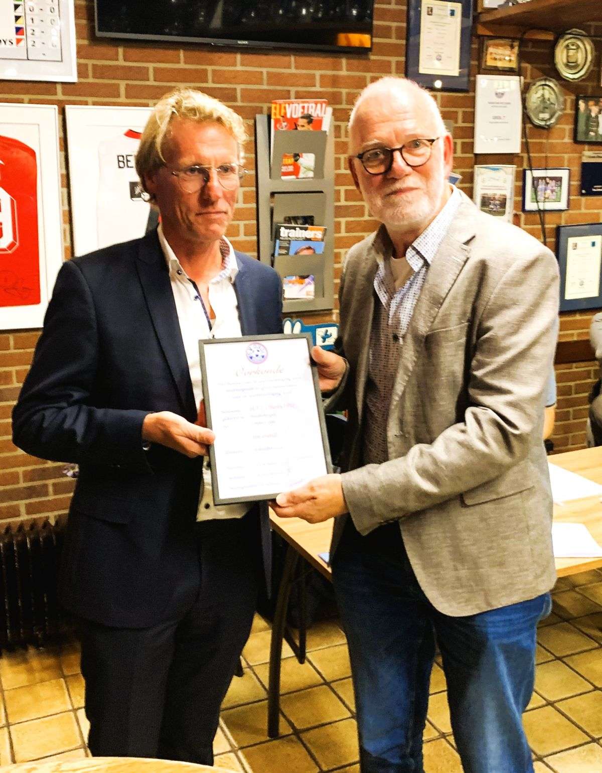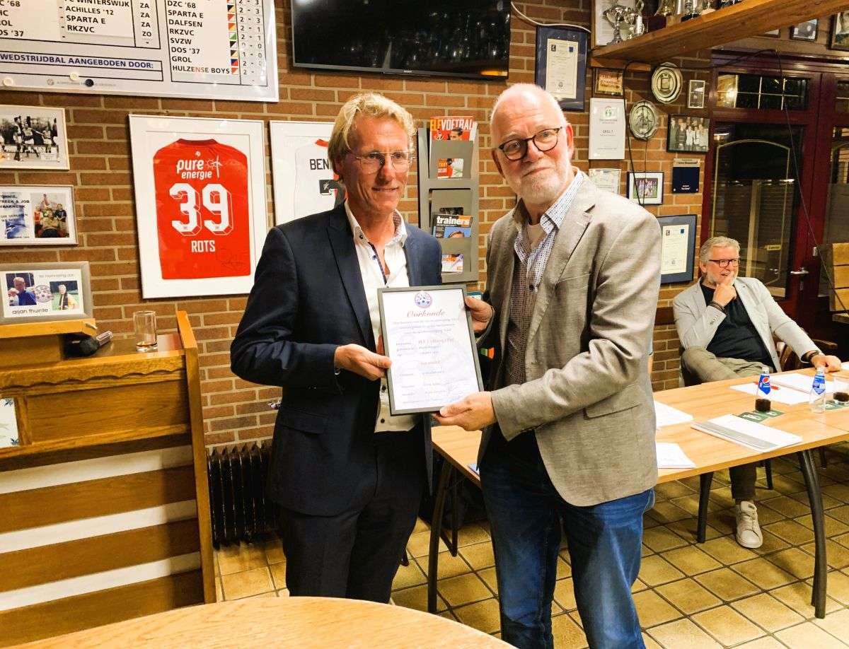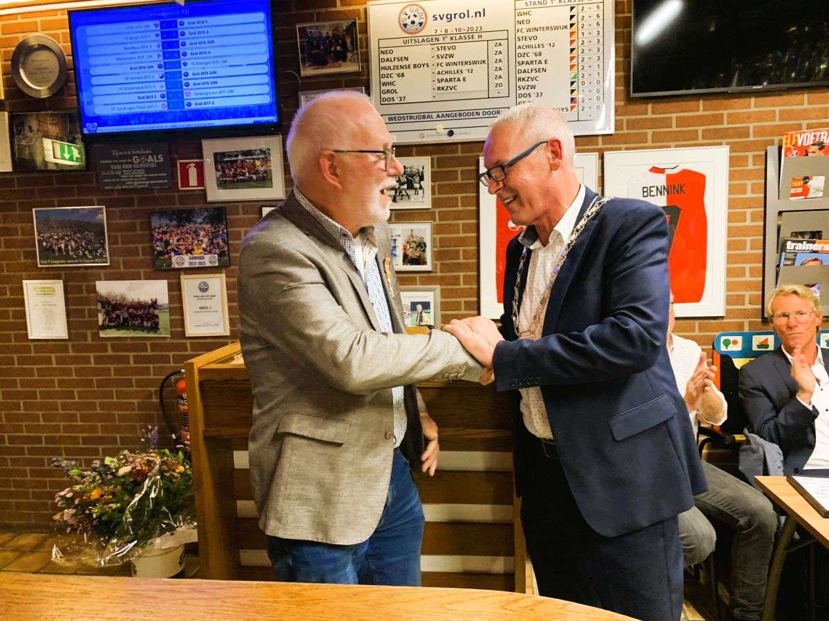 Het was wethouder, in dit geval locoburgemeester Jos Hoenderboom van de gemeente Oost Gelre, die het scheidende bestuurslid, en dat in het bijzijn van onder anderen zijn echtgenote en overige familieleden, de bijbehorende versierselen mocht opspelden. En daar bleef het niet bij. Want voorafgaande aan deze officiële handeling was dezelfde Harry Paf al onderscheiden met de titel ‘Erelid’ van de Groenlose sport- c.q. voetbalvereniging. In dit geval was de eer toebedeeld aan Grolvoorzitter Stan Raben om het scheidende bestuurslid, en dat met name in de functie van wnd. voorzitter, uit te zwaaien. Een en ander ging derhalve gepaard met de toekenning van de veel begeerde onderscheiding ‘Erelid’ van de Groenlose voetbalclub. Daarbij werd aandacht besteed aan de inzet van Paf op tal van terreinen ten behoeve van in eerste instantie S.V. Grolse Boys en inmiddels een aantal jaren de fusieclub S.V. Grol. Hierbij werd tevens nog eens terechte aandacht besteed aan de het vele werk van Paf ten behoeve van het fusieproces, hetgeen enkele jaren geleden heeft geleid tot een succesvolle samenwerking van de beide voetbalclubs.