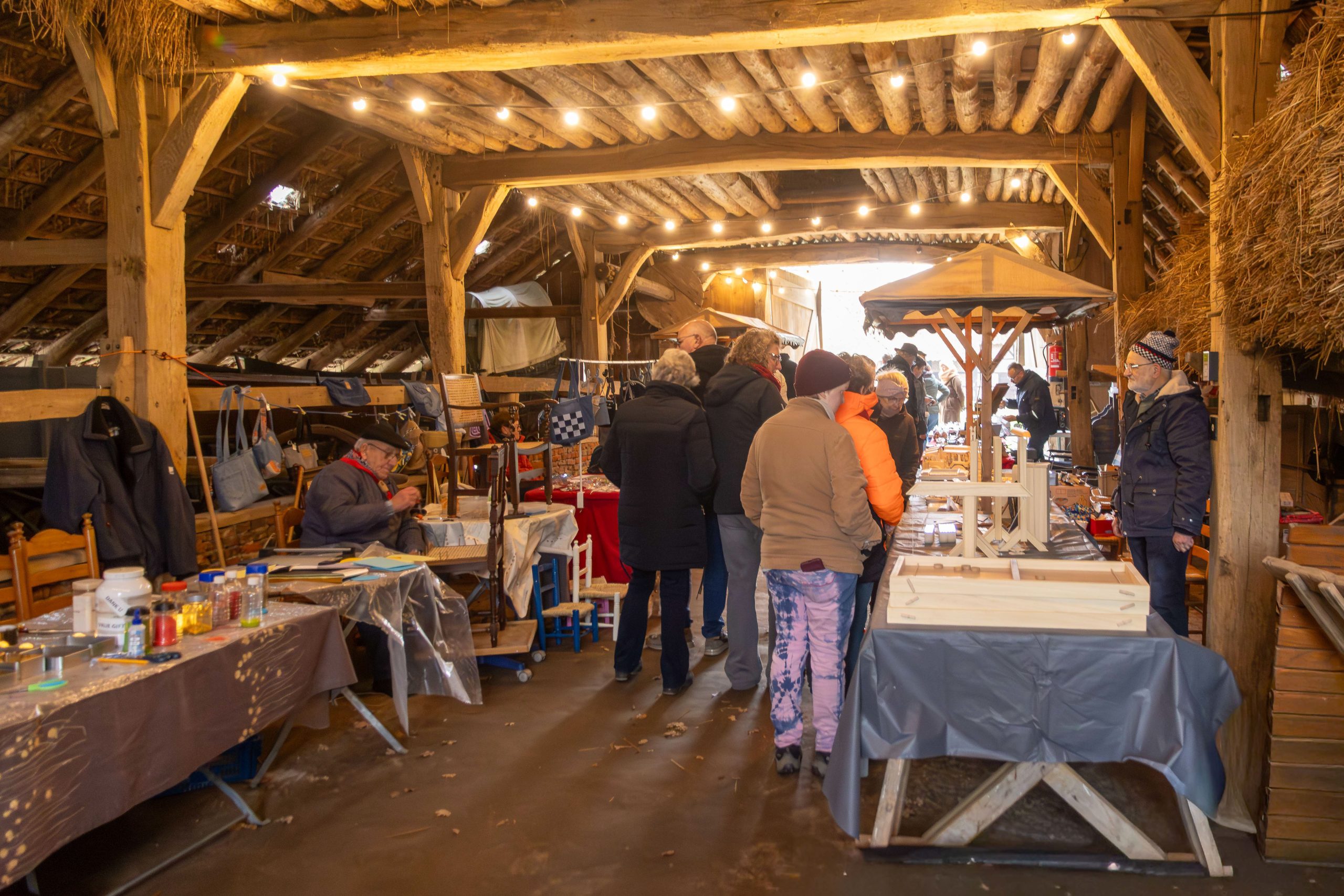 Binnen in de schuren was het gezellig druk. Tussen houten balken en strobalen stonden kramen met handgemaakte producten en winterse lekkernijen. Bezoekers warmden zich aan soep, chocolademelk en glühwein, terwijl midwinterhoorns buiten hun karakteristieke klanken over het terrein lieten horen.